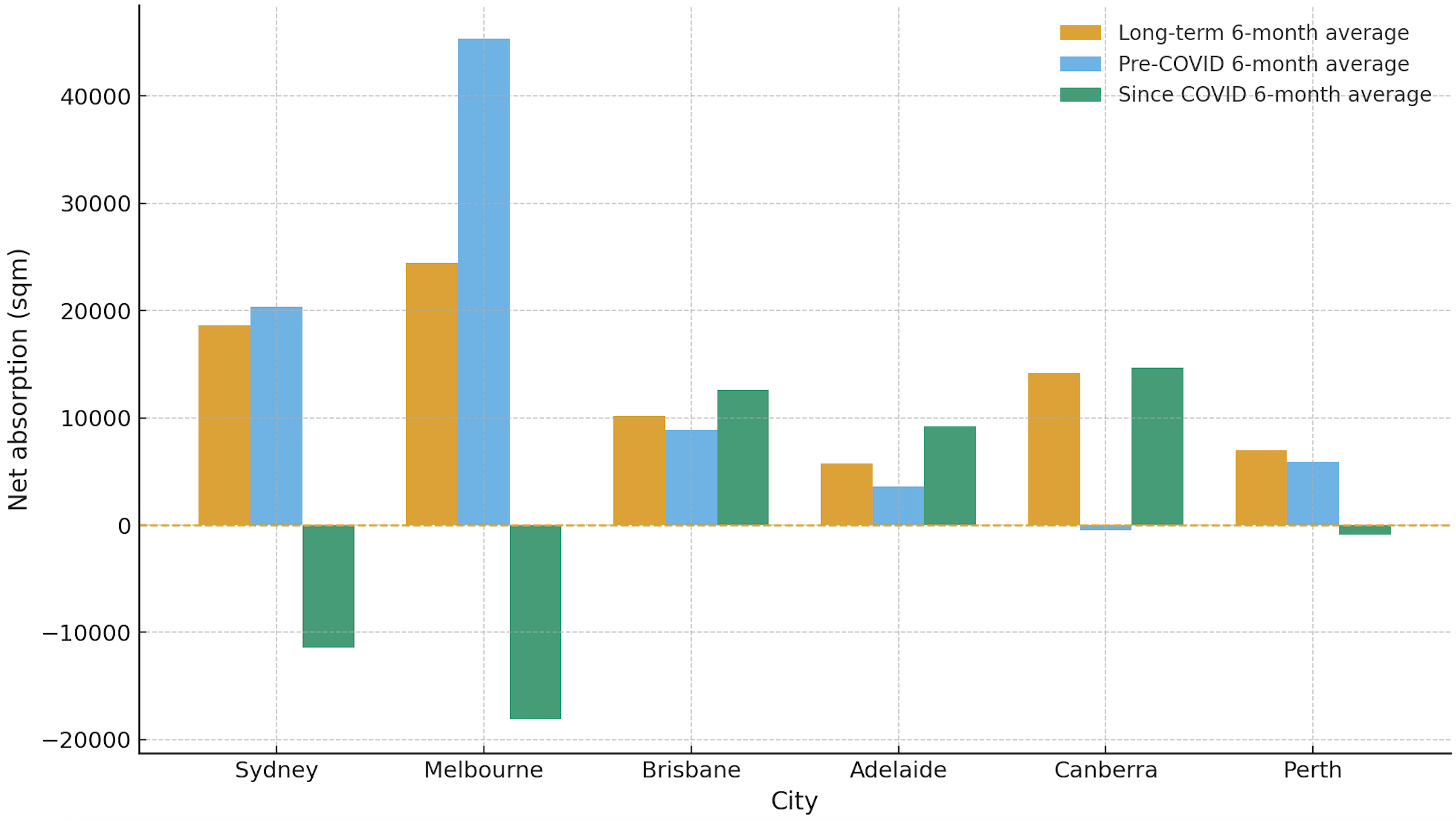 Sydney and Melbourne have a long way to go to reach the absorption levels prior to Covid. Both of these markets also happen to be the ones with the biggest tenants, the most back office, and the largest WFH proportions.