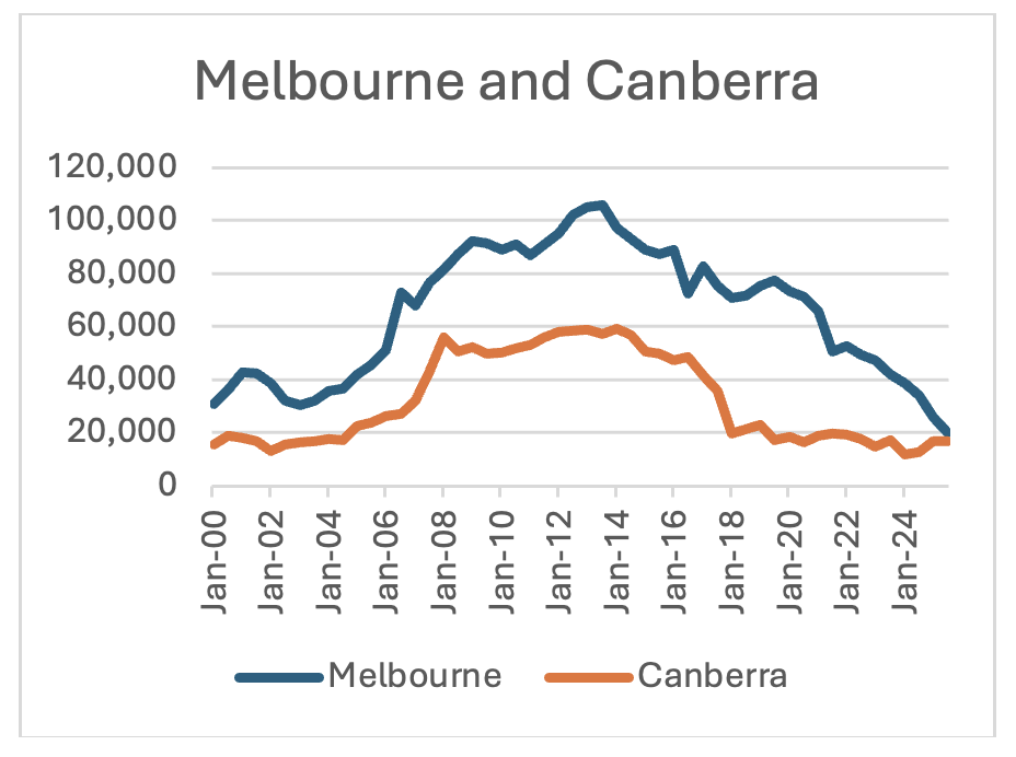 Melbourne and Canberra peaked at similar times and are slowly de-densifying.